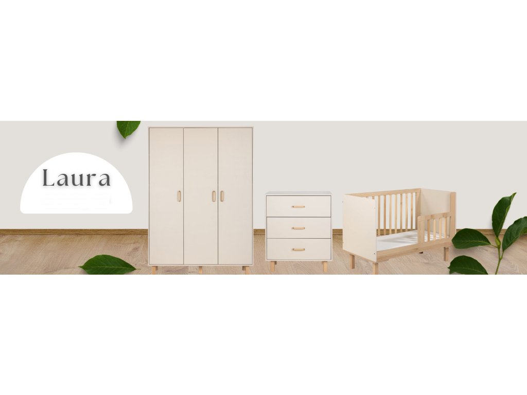 Sestava dětského nábytku LAURA v jemném šampaňském odstínu s detaily z bukového dřeva nabízí dokonale sladěný prostor pro vaše miminko. Tato nadčasová kolekce spojuje čistý design s praktickým využitím a kvalitou zpracování. Hodí se do moderních i klasických interiérů a poroste s vaším dítětem.