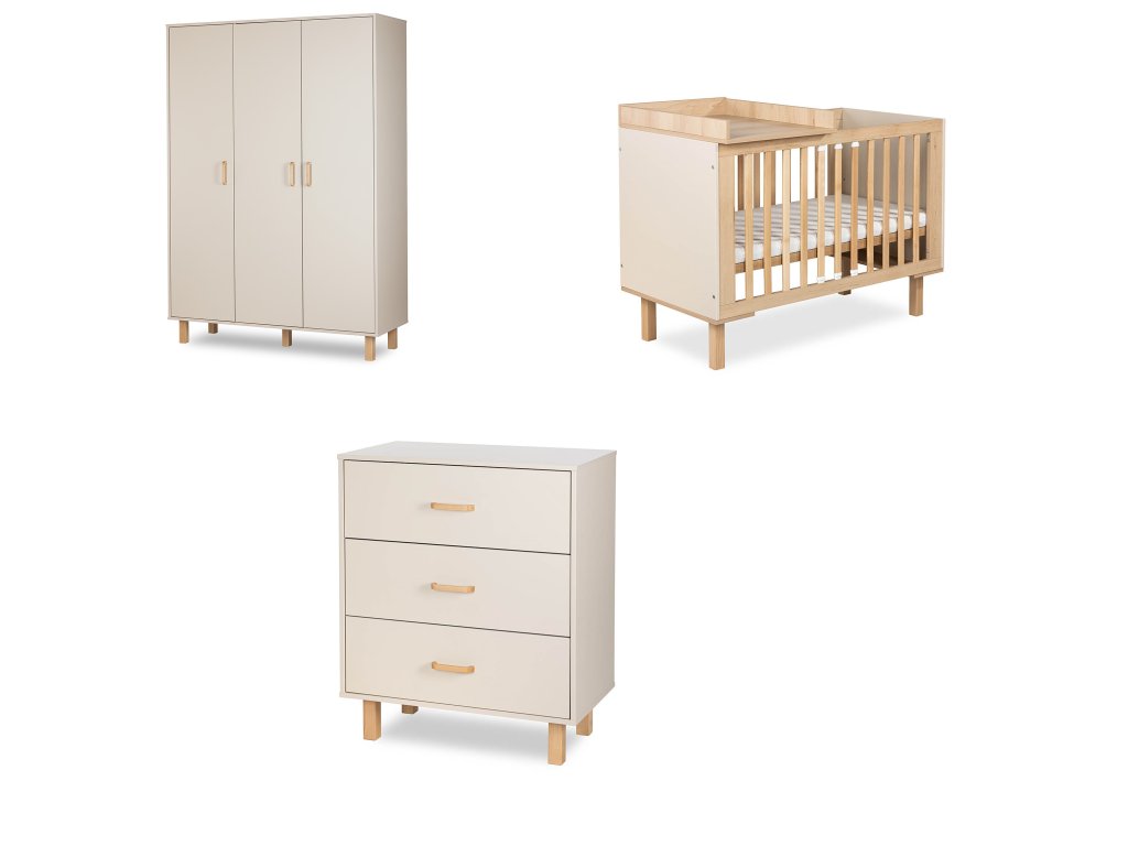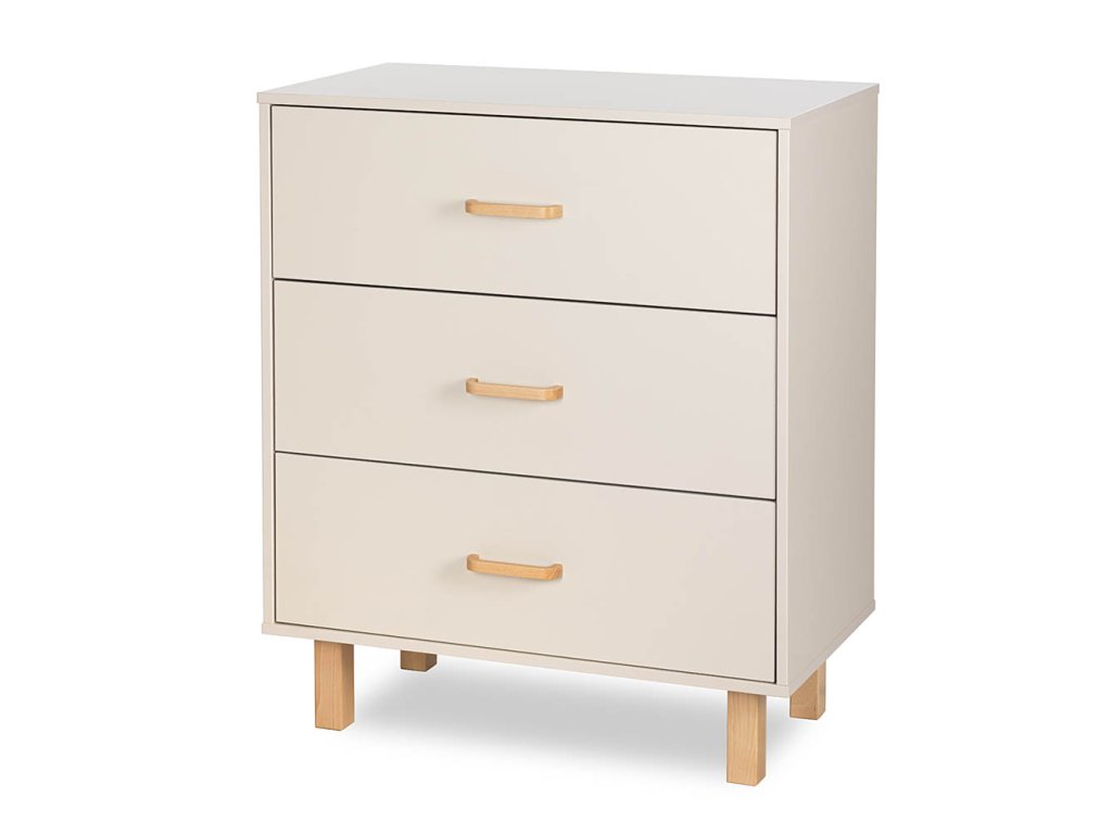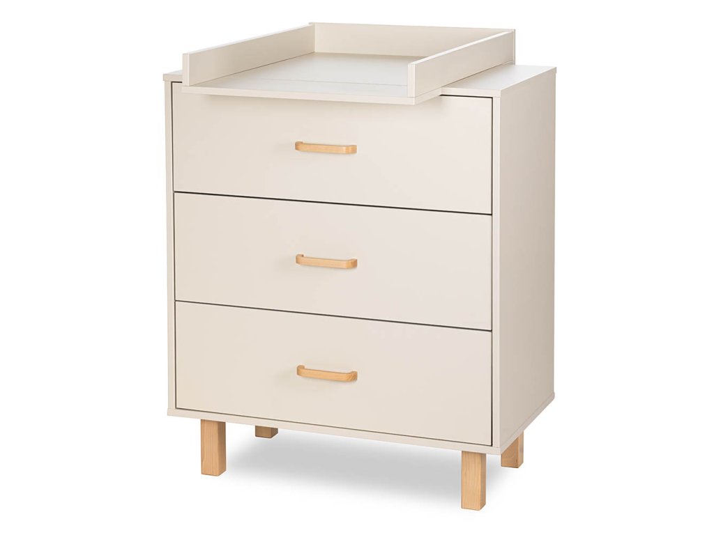 Elegantní komoda se třemi hlubokými zásuvkami s tichým dovíráním, vybavená přírodními úchyty z bukového dřeva a vysokými nožkami pro snadný úklid. Komodu lze doplnit o přebalovací nástavec (není součástí). Vhodná pro uložení oblečení, plen i kosmetiky – ideální do každodenní péče o miminko.
