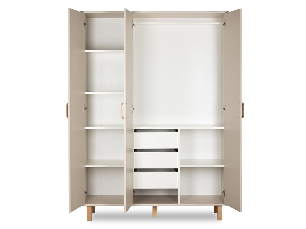 Velkorysá šatní skříň s třemi dveřmi, šatní tyčí, třemi zásuvkami a množstvím otevřených polic pro přehledné uložení oblečení a doplňků. Bukové úchyty a nožky dodávají lehkost a přírodní vzhled, zatímco praktická možnost odebrání spodní police pod tyčí umožní prostor uzpůsobit rostoucím potřebám dítěte.