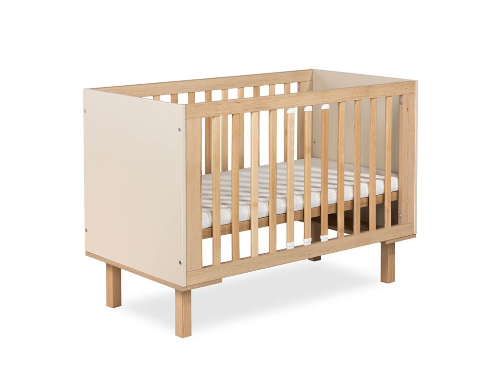 Stylová dětská postýlka s plochými bukovými příčkami a možností přeměny na otevřenou postel pro větší dítě díky přiložené zábraně. Nabízí tři výškové úrovně roštu, dvě vyjímatelné příčky pro samostatný vstup dítěte a pevnou konstrukci z bukového dřeva, MDF a nábytkové desky. Vhodná od narození až do předškolního věku.