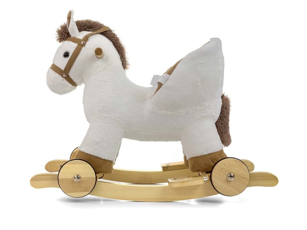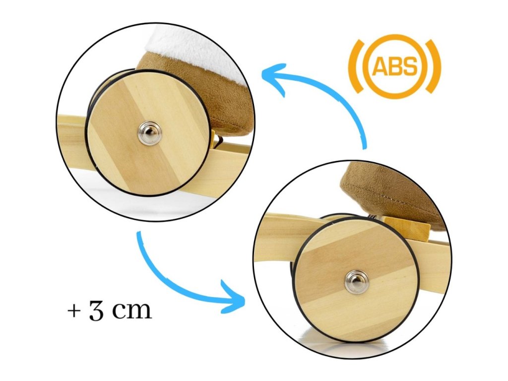 Dřevěné lyžiny s podnožkami a madly pomáhají dítěti udržet rovnováhu při houpání. Integrovaná skládací kolečka umožňují během několika sekund přeměnit houpacího koníka na plyšové vozítko, které lze snadno posouvat po podlaze.