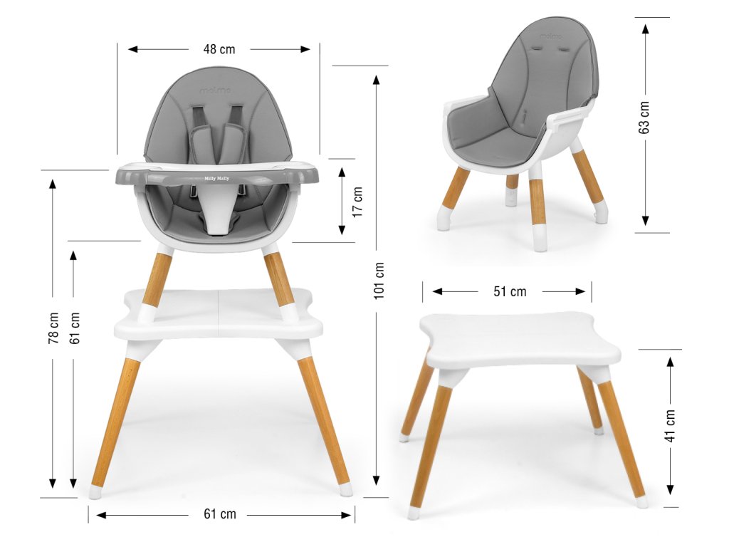 Moderní a stylová dětská židlička na krmení Malmo 2v1. Vyrobeno z nejkvalitnějších materiálů - spojuje funkčnost a moderní design. Vysoká židlička je určena pro miminka od 6 měsíců do 36 měsíců nebo do hmotnosti 15 kg a nízká verze - židlička se stolkem pro děti od 3 do 6 let nebo do hmotnosti 25 kg.