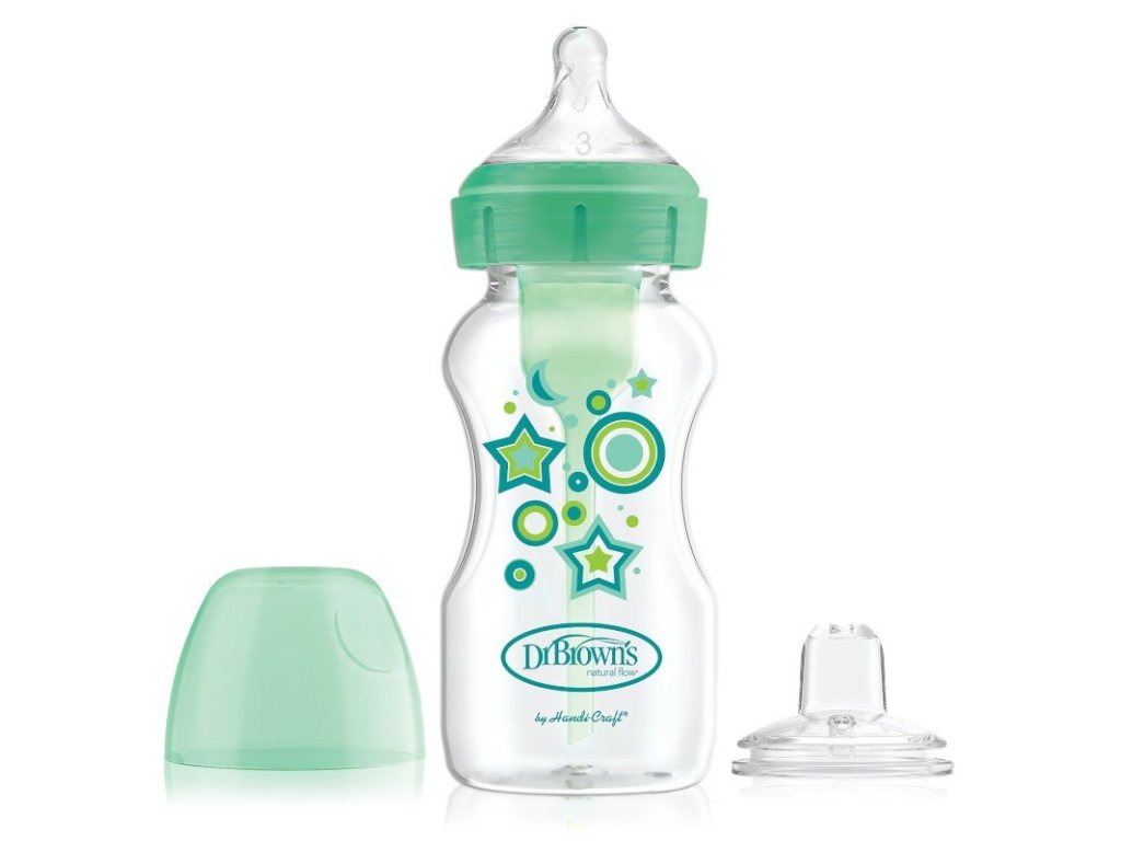 Zelený set se širokým hrdlem "Od láhve do šálku". Udělejte další krok ve vývoji svého dítěte s novou sadou z láhve na kelímek. Sada usnadňuje přechod od bradavky v lahvičce k náustku kalíšku. Láhev je vybavena dudlíkem úrovně 3 a navíc měkkým silikonovým nevylévacím náustkem. Když je vaše dítě připraveno, vyjměte vnitřní ventilační systém z láhve a nahraďte bradavku náustkem, který připraví vaše dítě na pití z hrnečku. Láhev Dr Brown's Options + se širokým hrdlem o objemu 270 ml je k dispozici v různých provedeních a barvách. Sada je určena pro děti od 6 měsíců. Horní police vhodná do myčky a sterilizovatelná.