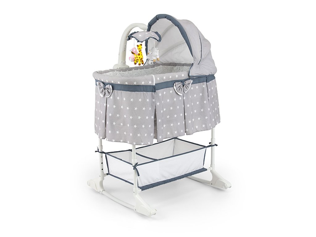 Kolébka má pevnou konstrukci, prošívanou vnitřní podšívku a vinylovou matraci, která se snadno čistí. Díky nastavitelnému baldachýnu poskytuje dítěti ideální prostředí pro spánek.