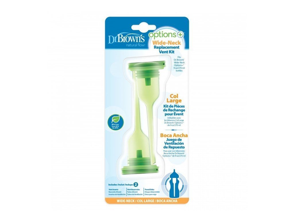 Dr Brown's Sada náhradních dílů pro 270 ml Options + láhev se širokým hrdlem. Sada náhradních dílů pro ventilační systém. Hodí se k lahvičce Dr Brown's Options +. Lahve Dr Brown's Options + spolu s ventilačním systémem regulují tlak uvnitř lahve. Tím se snižuje výskyt koliky, říhání a plynatosti. Sada je ideální pro výměnu opotřebovaných nebo poškozených částí antikolikového systému. Sada obsahuje: 2 nástavce pro ventilační systém, 2 nálevky pro ventilační systém. Výrobek se snadno čistí a neobsahuje bisfenol A. Horní police vhodná do myčky a sterilizovatelná.