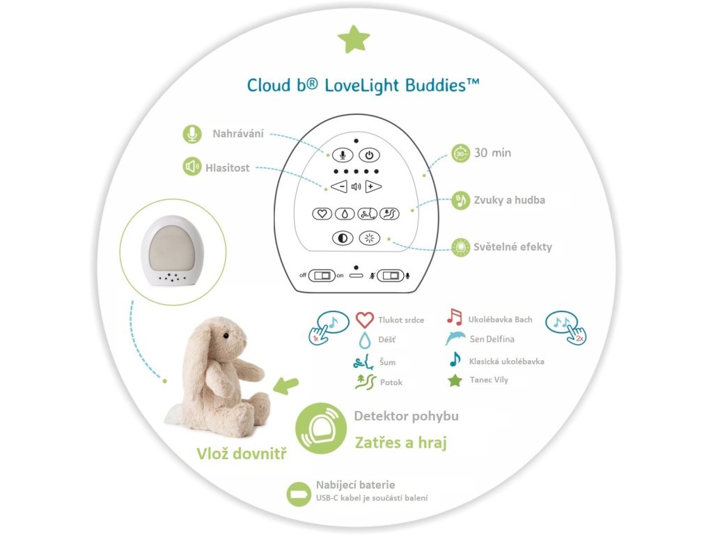 Plyšový zajíček je přes den skvělý parťák na hraní a v noci uklidňující světlo. Bude to jeden z nejlepších přátel vašeho dítěte při hraní nebo před spaním, kdykoli a kdekoli!