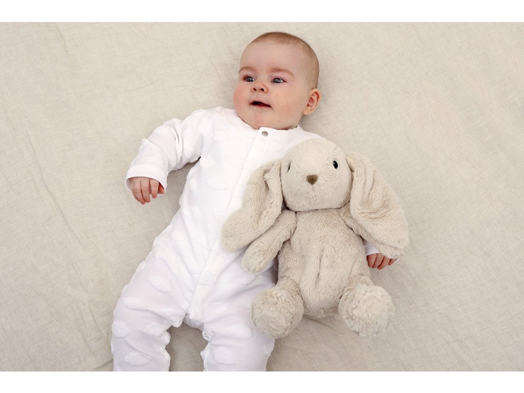 Měkoučký a roztomilý plyšový králíček má zapínání na suchý zip, díky kterému snadno připevníte oblíbeného společníka vašeho miminka na postýlku, kočárek nebo autosedačku. A když plyšák potřebuje vanu, stačí sundat soundbar a maskota hodit do myčky.
